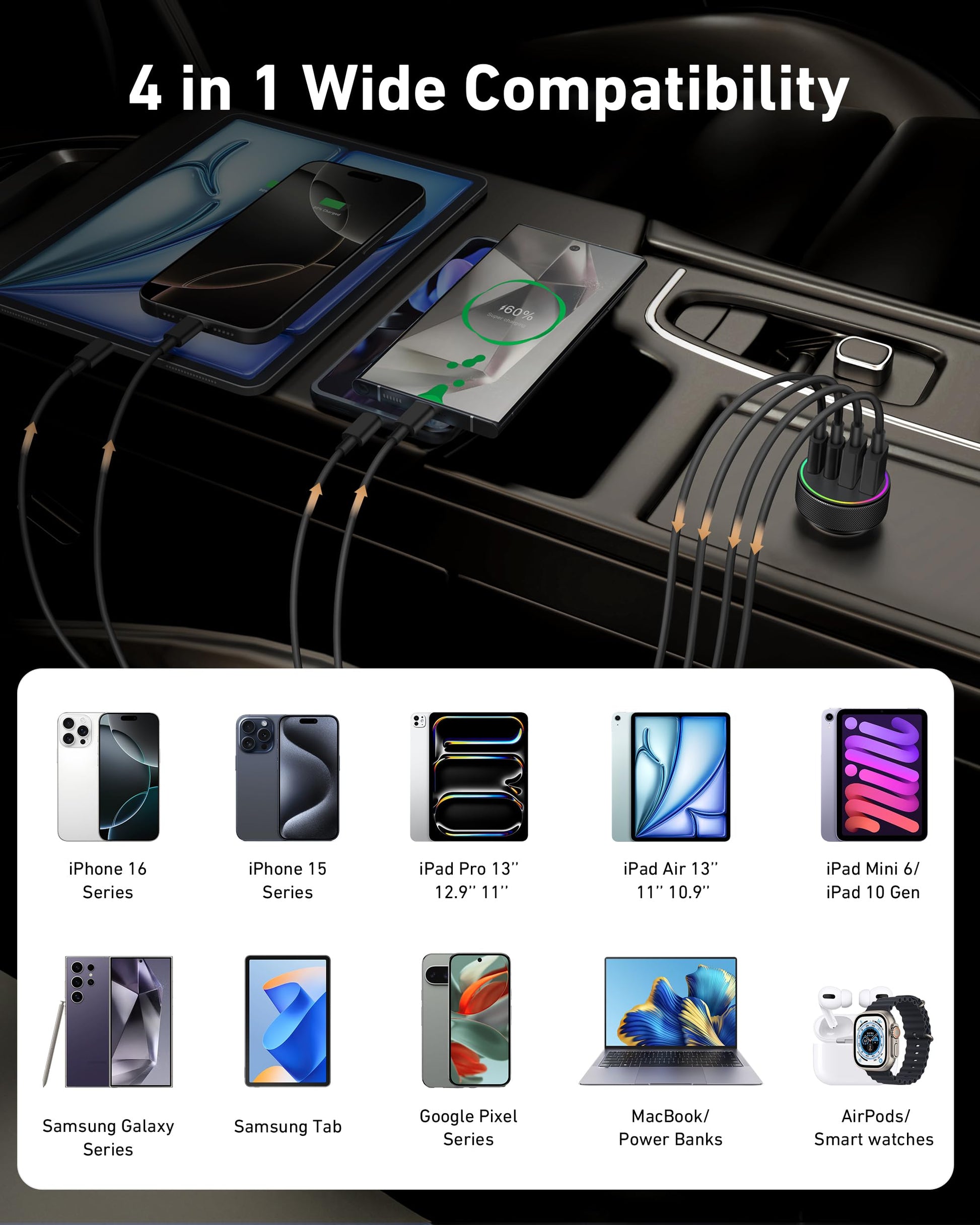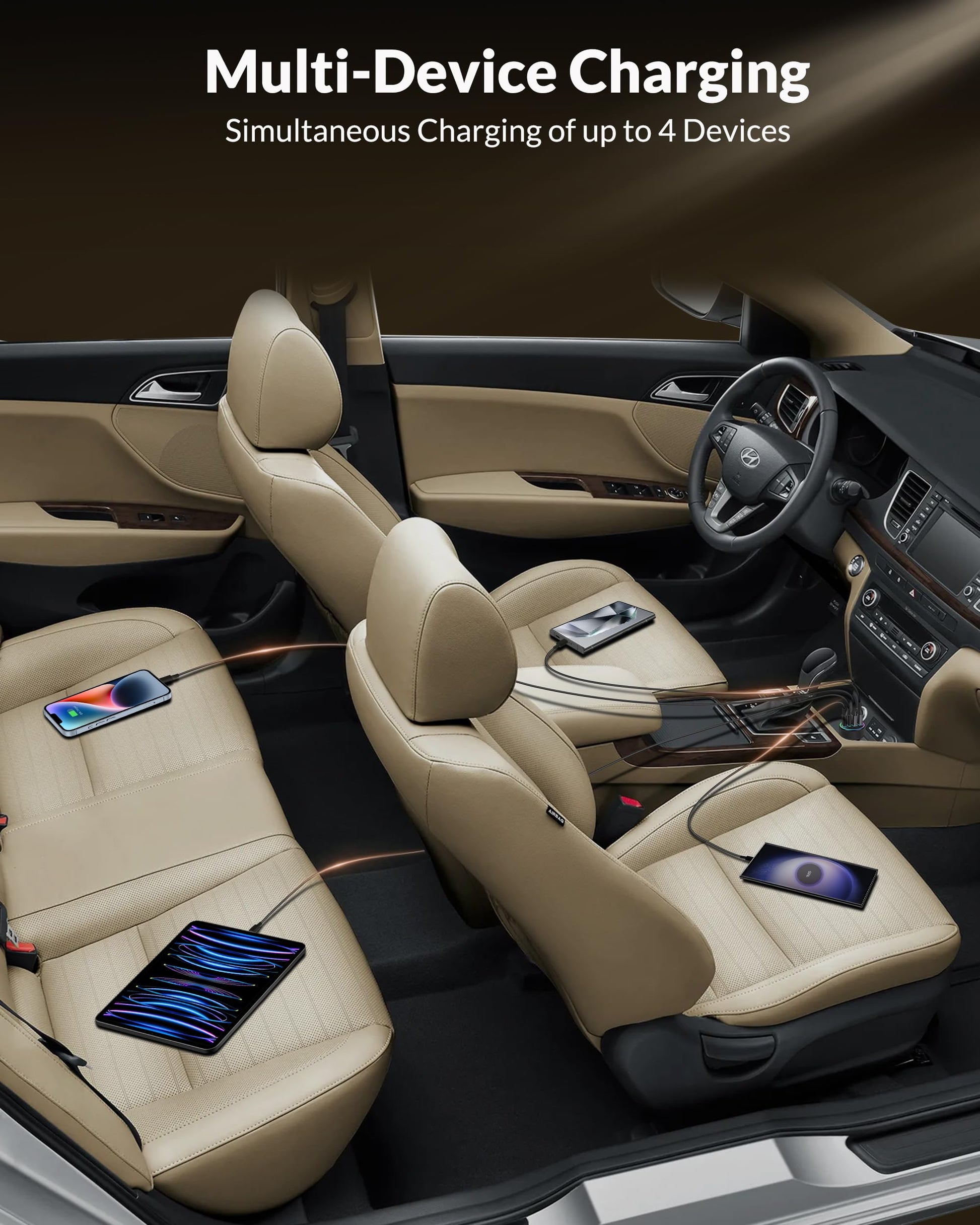 4-Poorts 90W Sigarettenaansteker USB C, Autolader Dual USBC & USB-A Multi PD/QC snel auto-opladen 12V adapter Car Charger voor iPhone 16 15 14 13 12 Pro Max, iPad, Samsung Galaxy S24/S23/S22