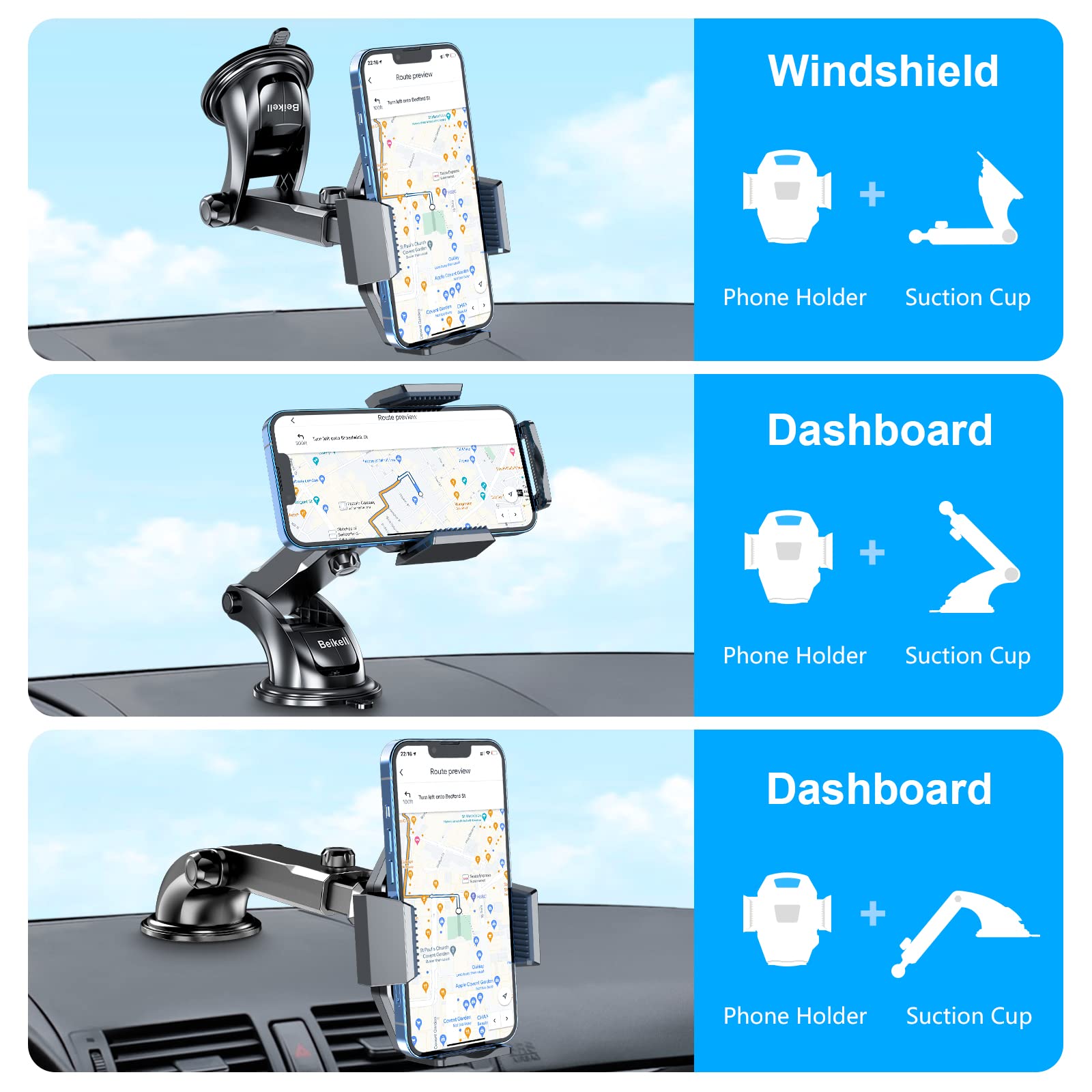 Beikell Mobiele Telefoonhouder voor Auto, 360 Graden Draaibaar Autotelefoonhouder met Één-Knop-Release, Voor montage op Dashboard & Glasplaat, Compatibel met iPhone, Galaxy en Andere Smartphones