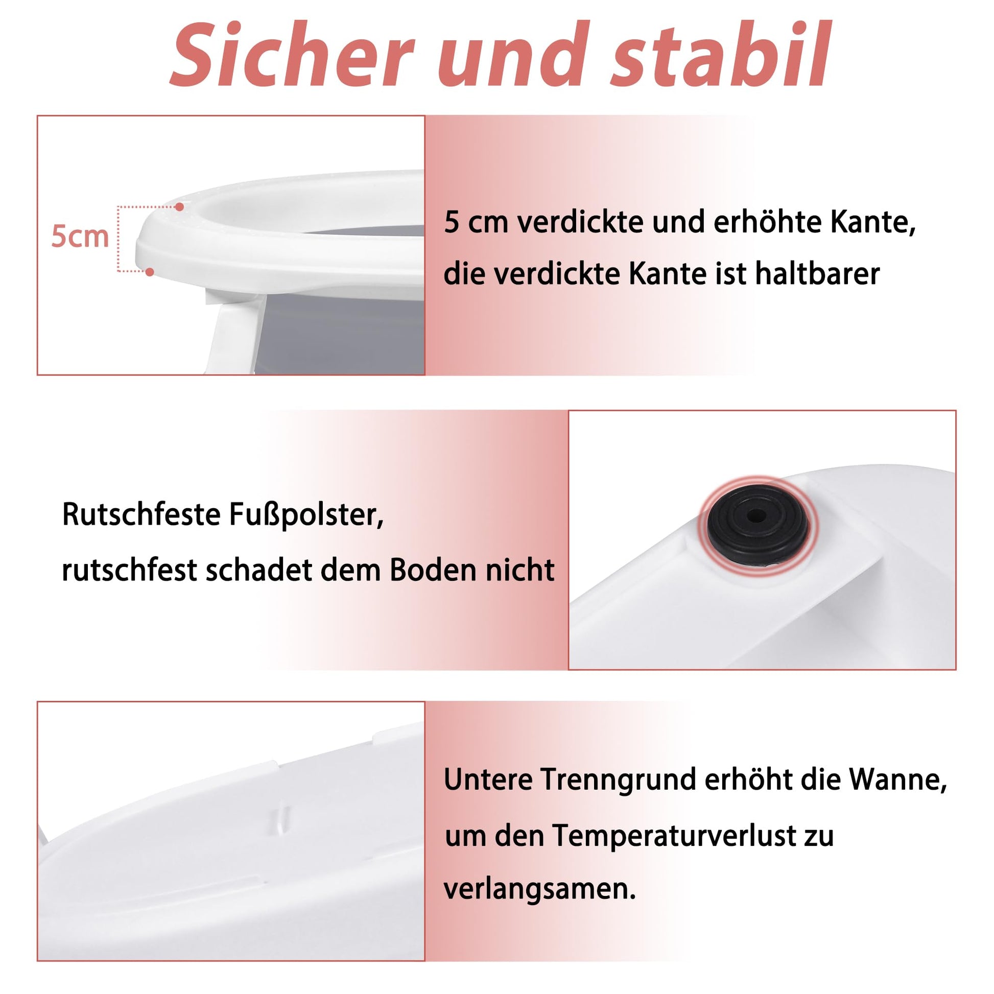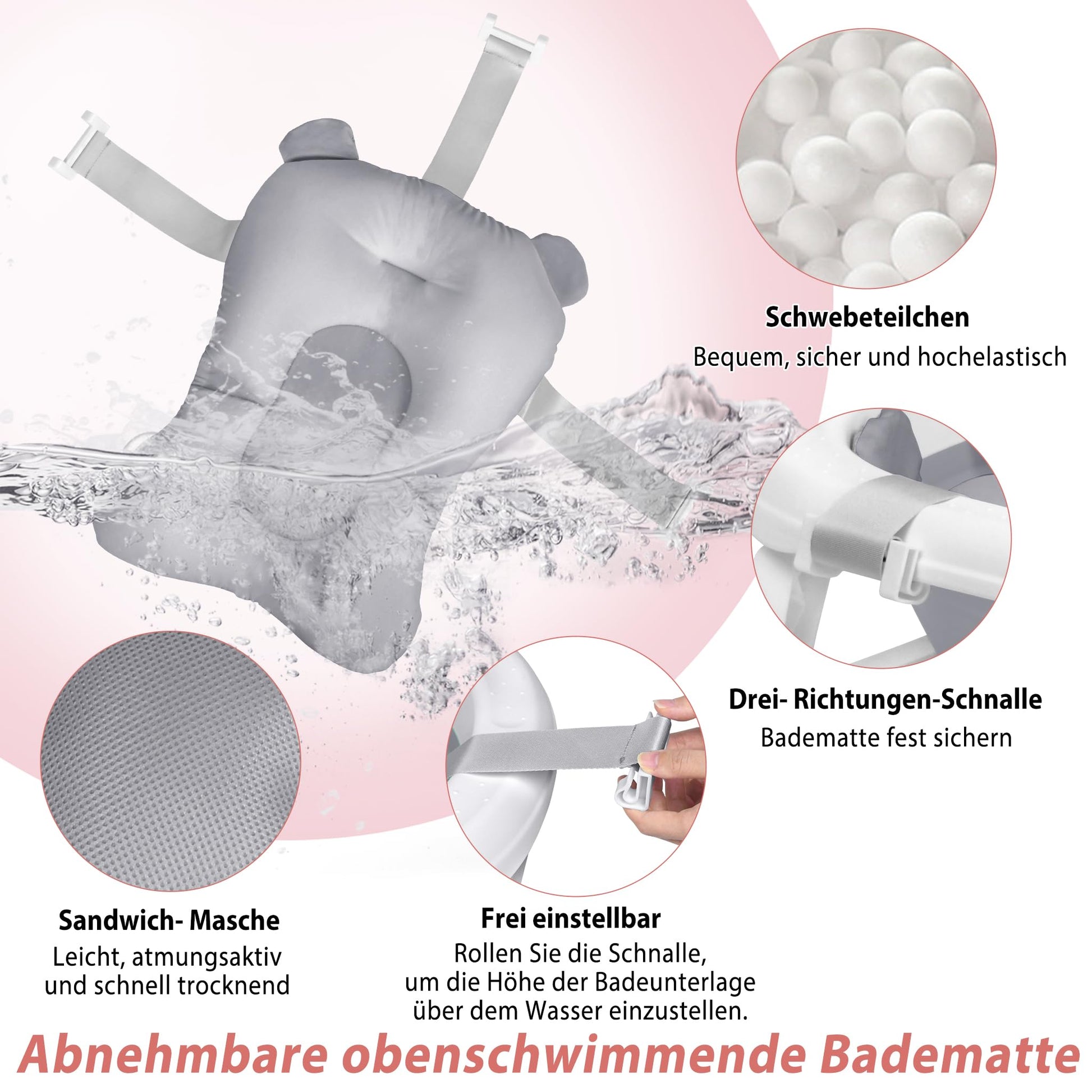 - Afneembare en comfortabele babybadmat: ons badkussen is gevuld met milieuvriendelijke pellets, die zeer elastisch en drijvend zijn. Het sandwich-mesh-weefsel zorgt voor ademend vermogen en sneldrogend, terwijl de hoogte van de badmat vrij instelbaar is. Met drie veiligheidssluitingen biedt het je baby een veilige grip en maximaal comfort tijdens het baden.