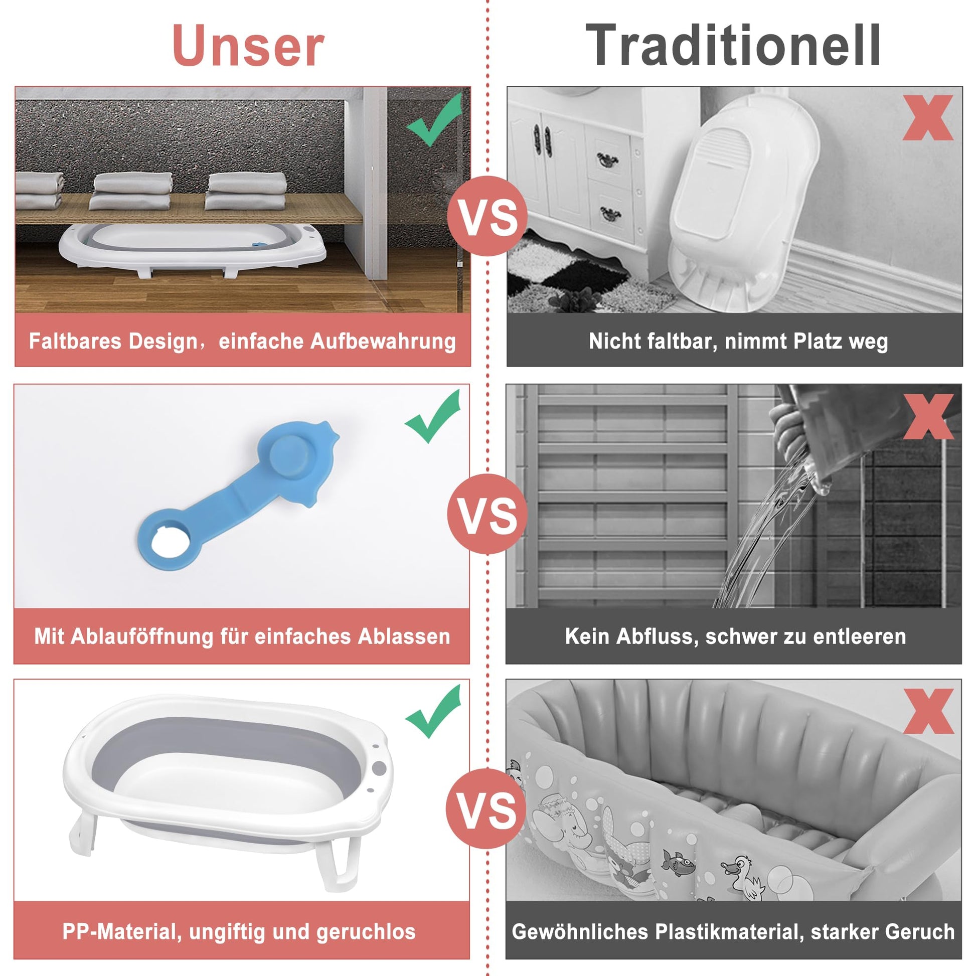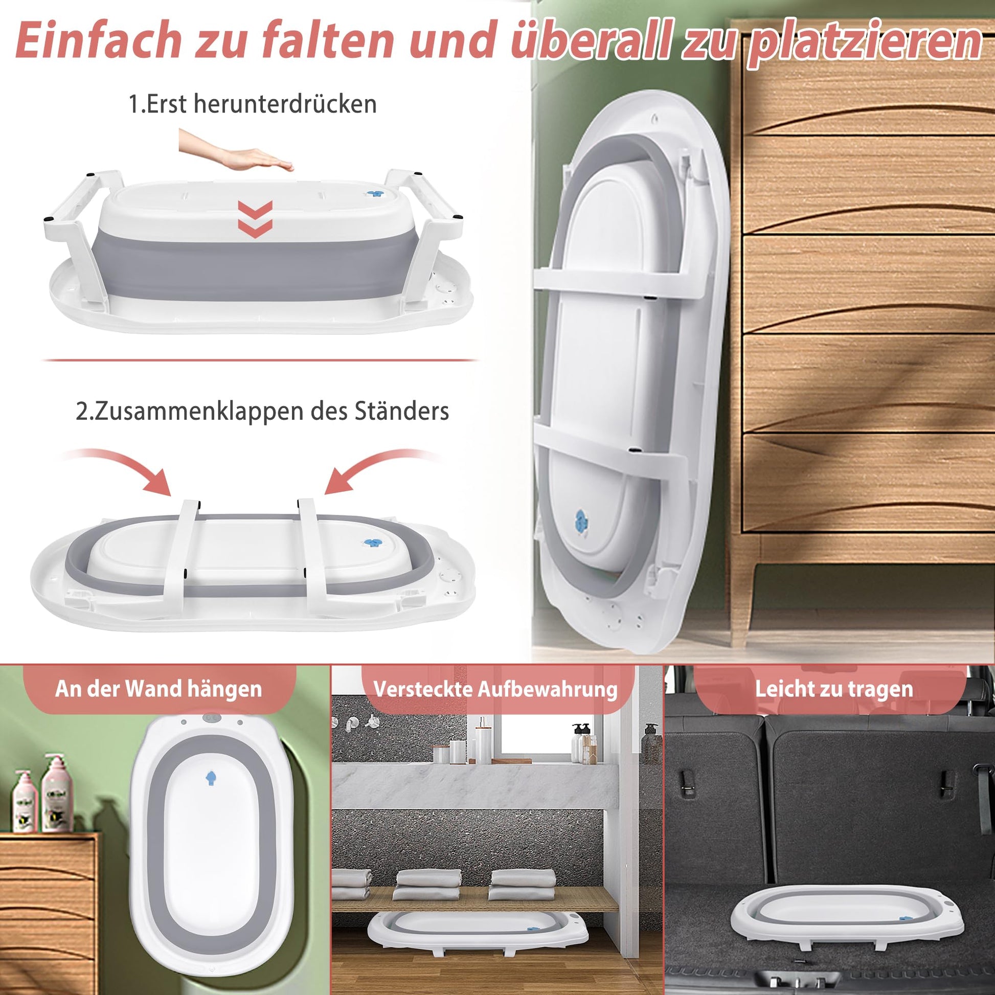 - Opvouwbaar en draagbaar: onze babykuip kan tot slechts 10 cm dikte worden opgevouwen, wat betekent dat hij gemakkelijk in de kofferbak van je auto kan worden opgeborgen en perfect is voor onderweg. Geniet overal van het baden van je baby zonder je zorgen te hoeven maken over grote badkuipen.